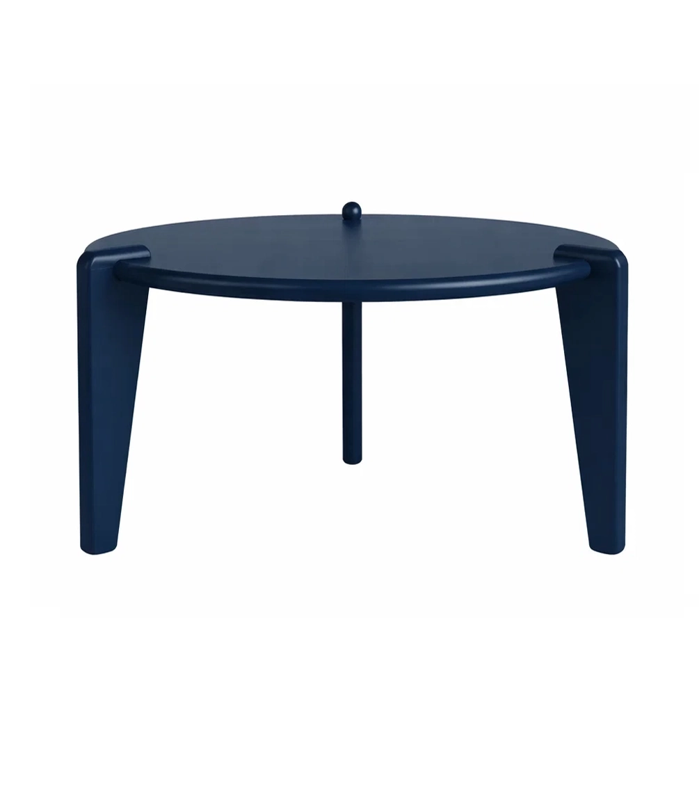 Klasyczny, okrągły stolik kawowy wykonany z litego drewna dębowego wybarwionego na kolor niebieski. Mebel o bardzo czystej, niemal organicznej formie. Mebel w kolorze granatowym.